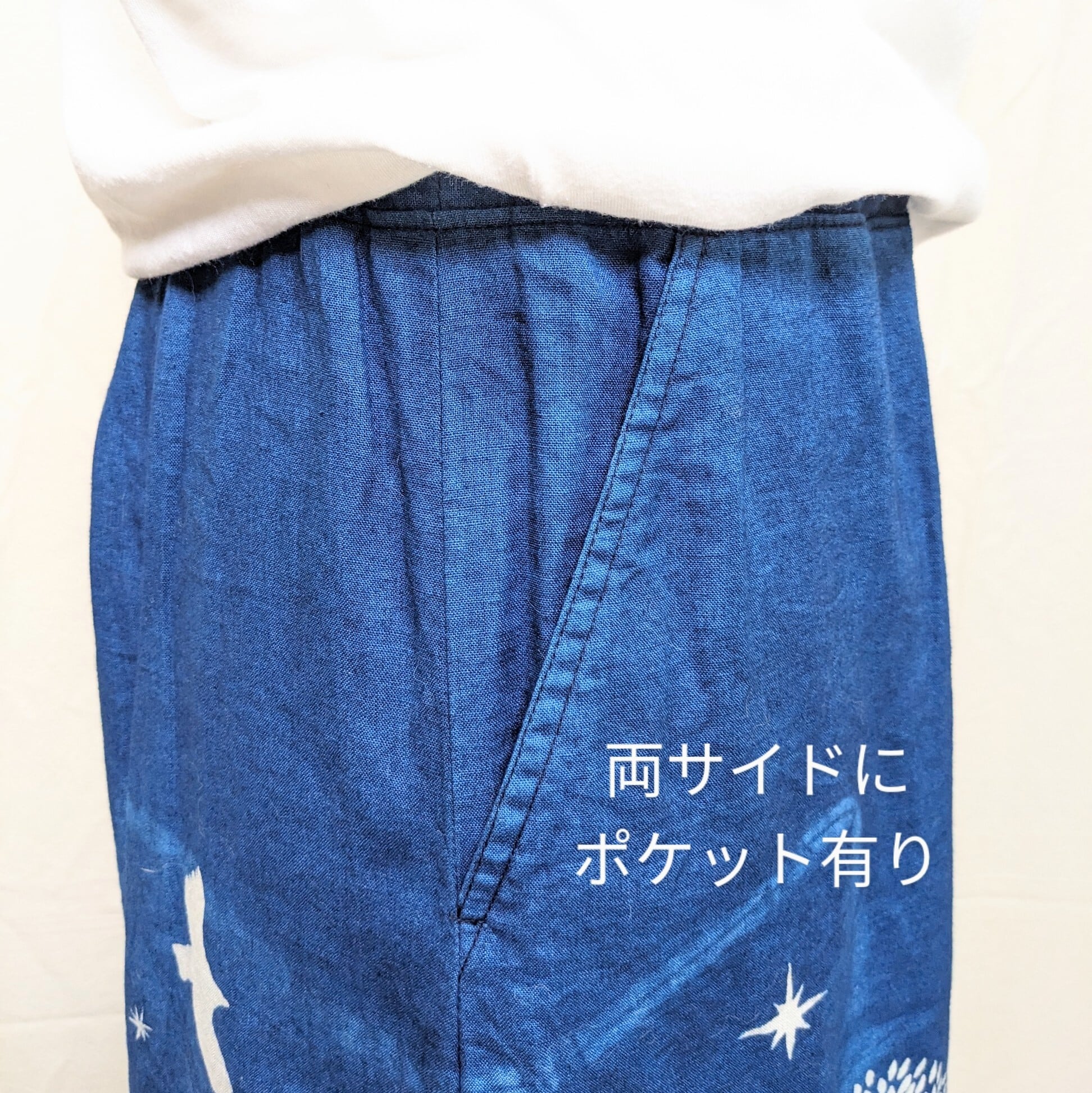 フレアタイプで裾がフワリとなびいて、右足の月満ち欠けや星形の絞り模様も軽やかで涼し気な印象です。
