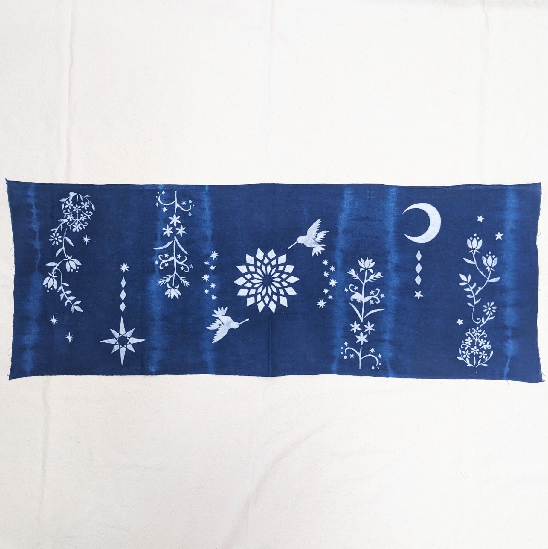 絞り染めと抜染にて、動植物や天体など自然のモチーフを藍色の世界で表現しています。