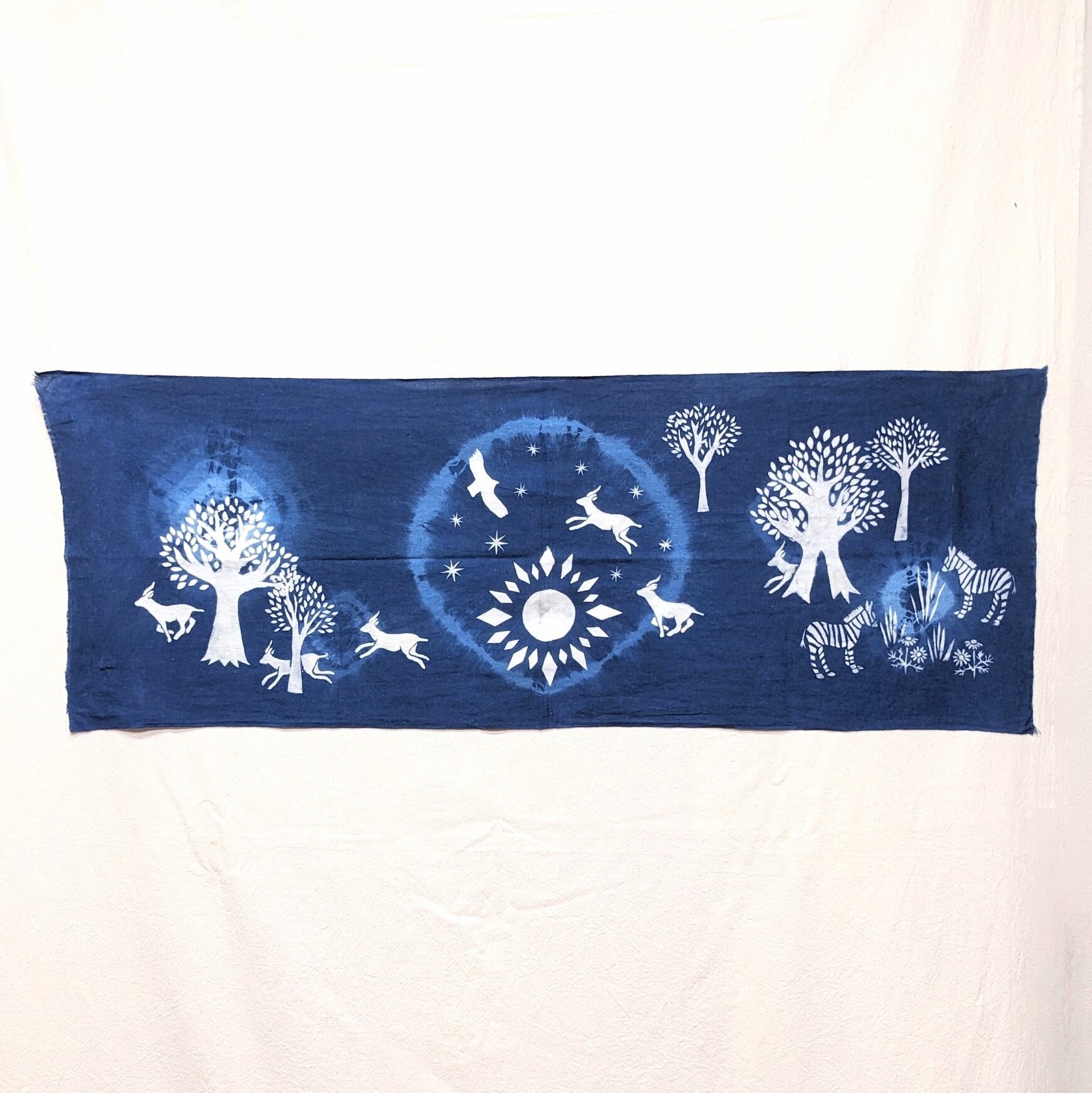 絞り染めと抜染にて、動植物や天体など自然のモチーフを藍色の世界で表現しています。