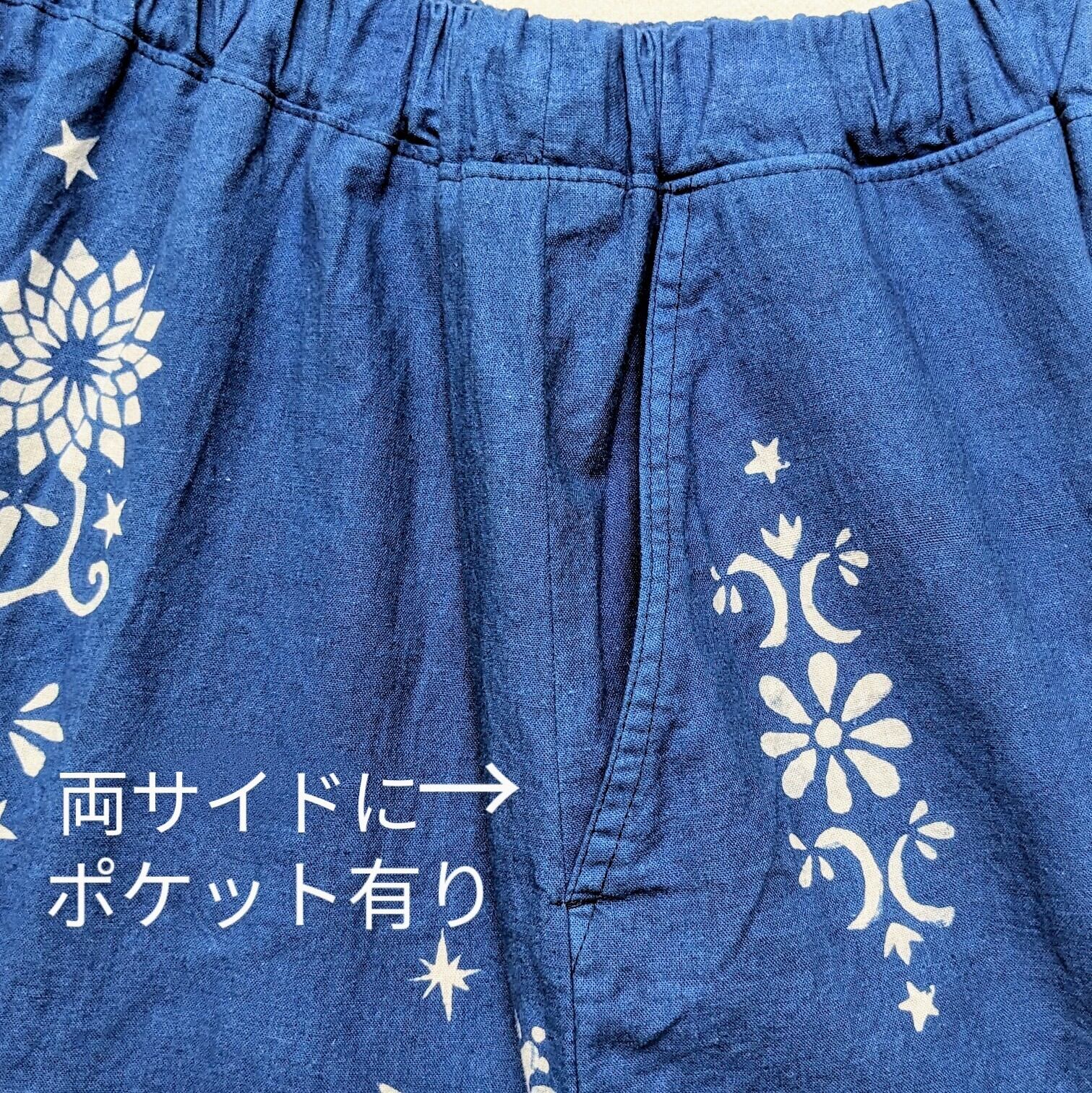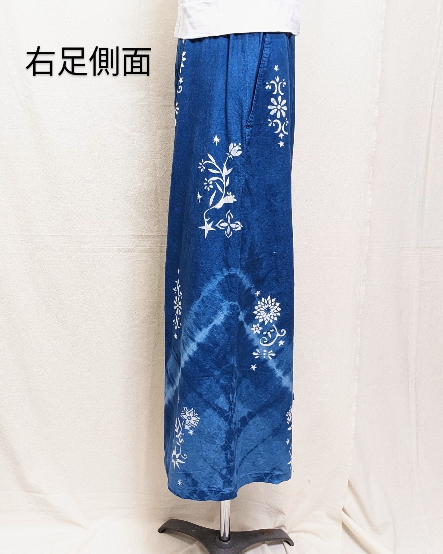 フレアタイプで裾がフワリとなびいて、左足に月、右足に植物模様が散りばめられた、華やかな印象のパンツです。