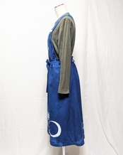 2本の肩紐を後ろで交差して、胸当てのボタンで留め、ウエスト部分はベルトループに通した共紐でお好みのフィット感で結んでいただくタイプのサロペットスカートです。
