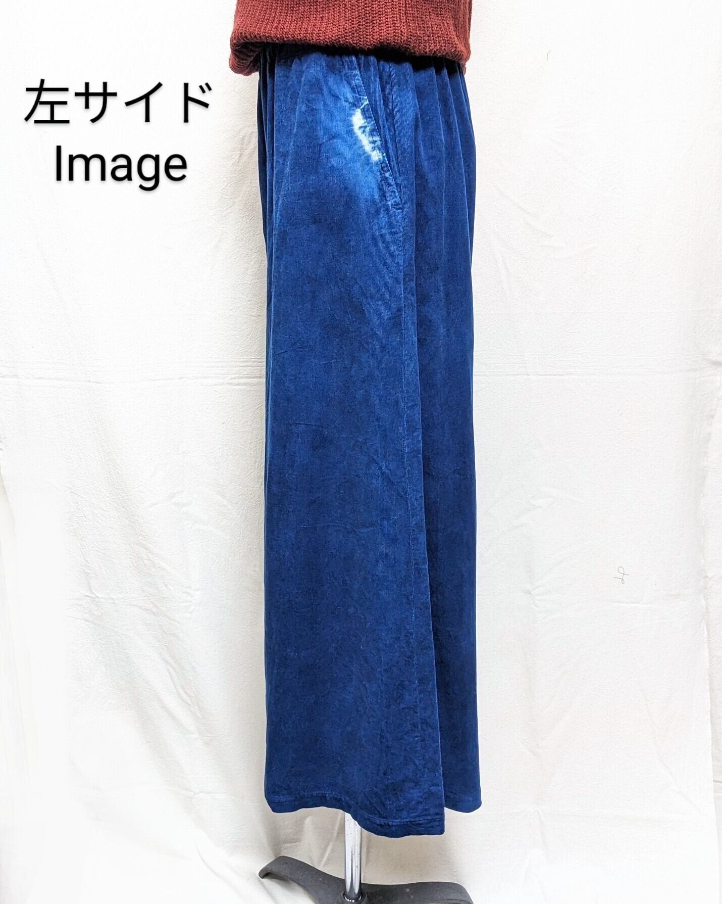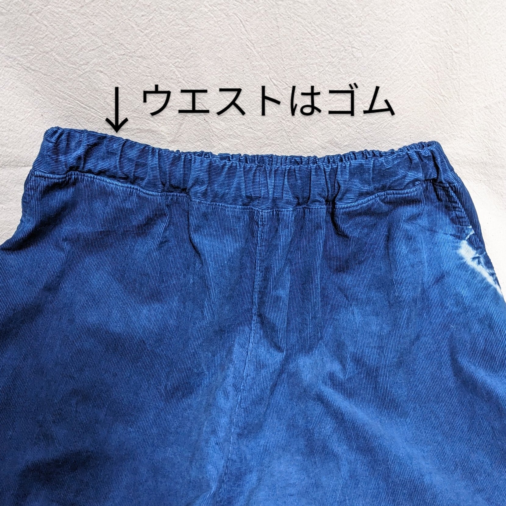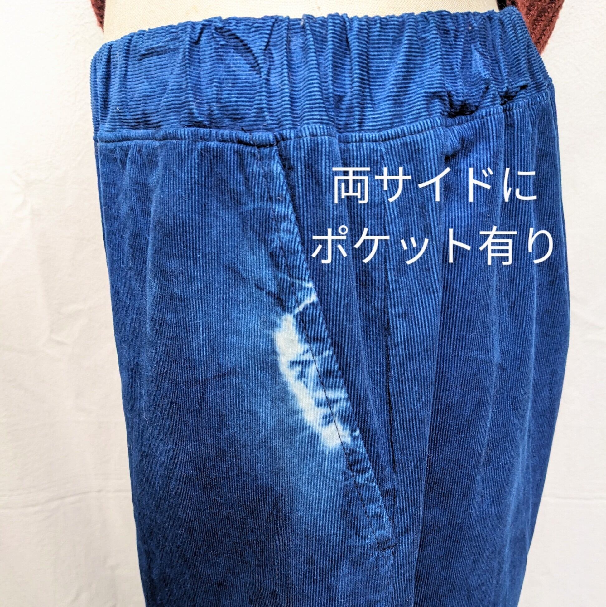 薄手で柔らかなコーデュロイ生地(畝幅:約1ミリほどでシャツなどに使われる生地)なので、太めのフレアタイプですが、裾がフワリ軽やかです。そしてコーデュロイ特有の光沢感ある藍色も綺麗です。