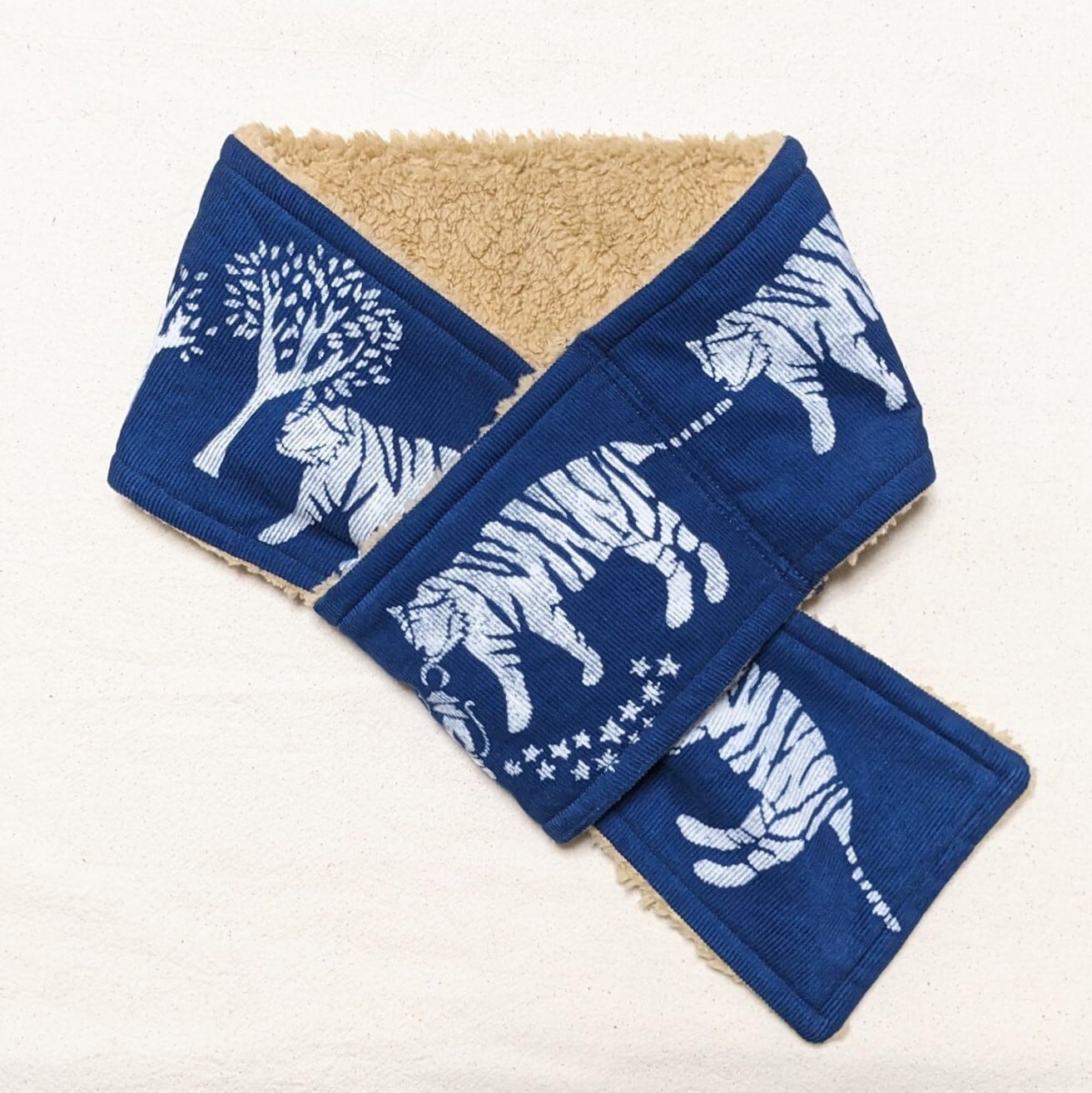 藍染めコーディロイ生地面と起毛面(ライトベージュ)の、どちらを表にしてもお使い頂ける、リバーシブルネックウォーマーです。
